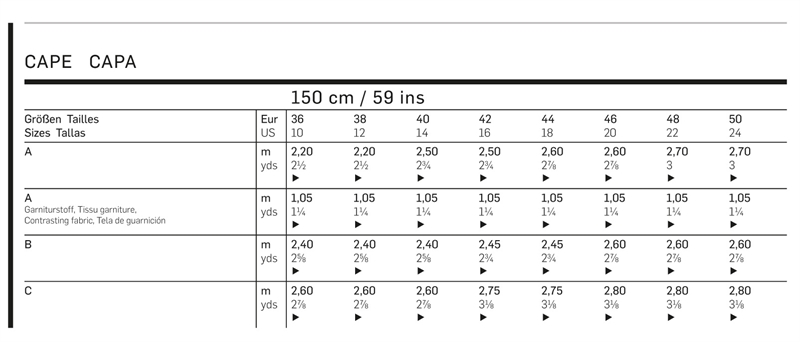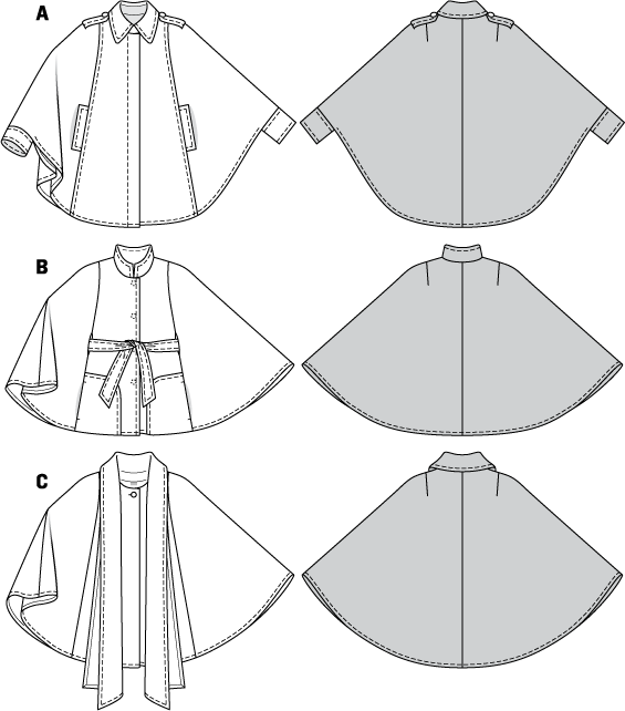 Capes to all tastes and for all occasions. A sporty, with shoulder tabs, side pockets and wrist band. View B cinched at the waist with a belt springing from the side slits. C with casual scarf.