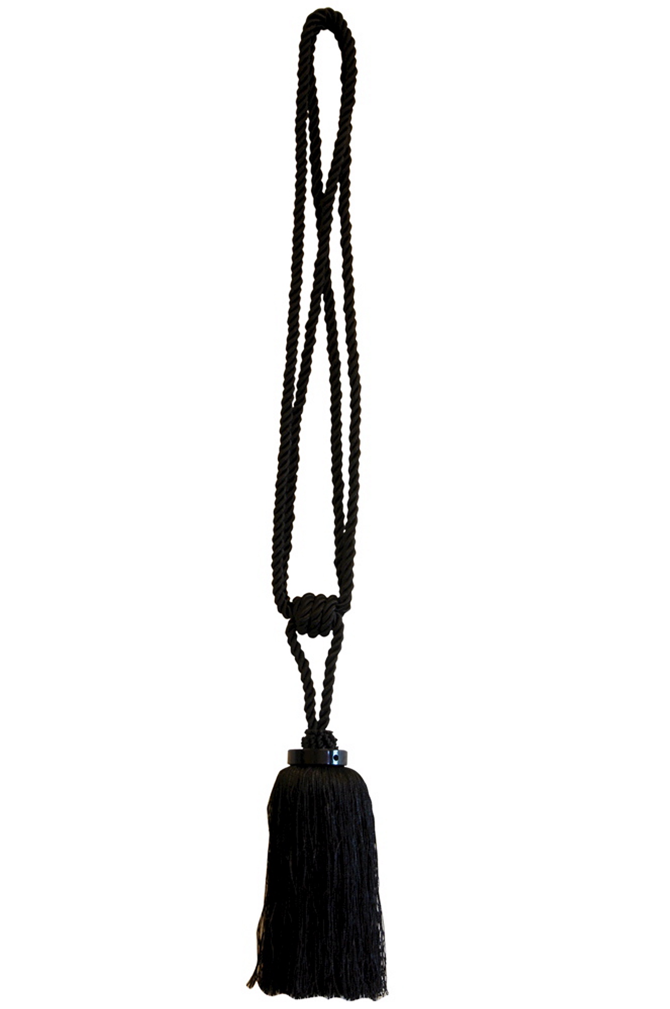 Modern omtagstofs i svart med dekorativ ring i svart. 1 st/fp. Längd 65 cm inkl tofs.