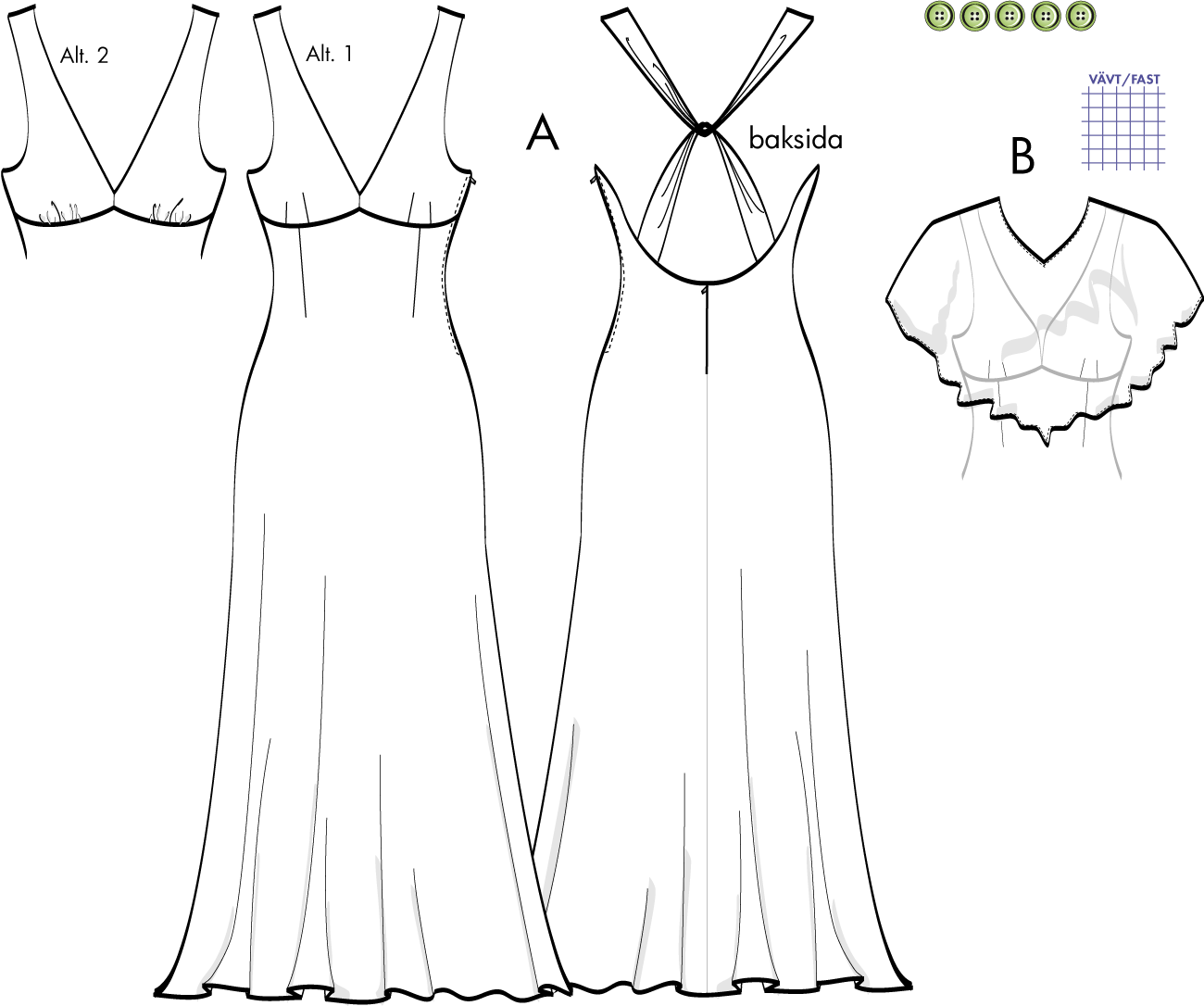A: Klänning, fodrad. Djup urringning fram där du kan välja om byst-delen ska ha insnitt eller rynkor. Bar rygg med korsade, draperade band. Hellång på mönstret, ändra till valfri längd. Blixtlås i vänster sidsöm. Passar "slinkiga" tyger, t ex mjukt siden, polyesterblandningar och viscose. Ev. foder bör vara i viscose eller liknande. Kan också sys ofodrad (byst-delen sys dubbel).