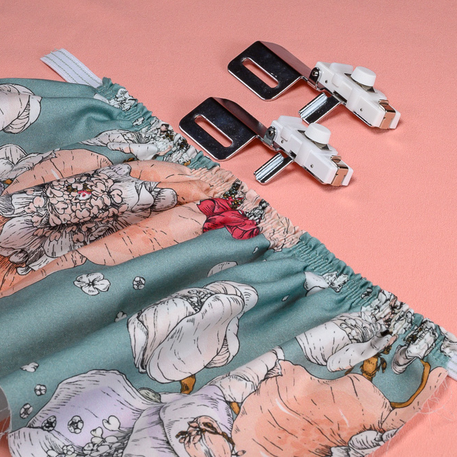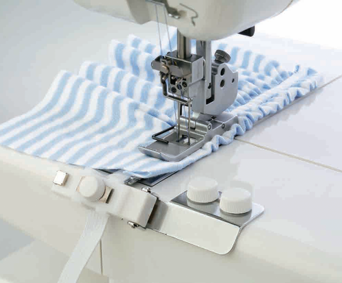 Resårrynkningsapparaten används till att sy fast resårer. Välj mellan två olika storlekar, en för 6 – 8,5 mm breda resårer till t.ex. underkläder och barnkläder eller den för 9 – 13,5 mm breda resårer till allmän beklädnadsömnad.