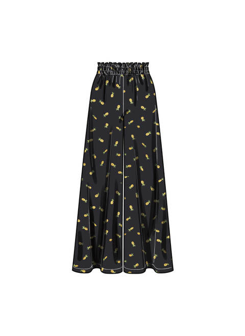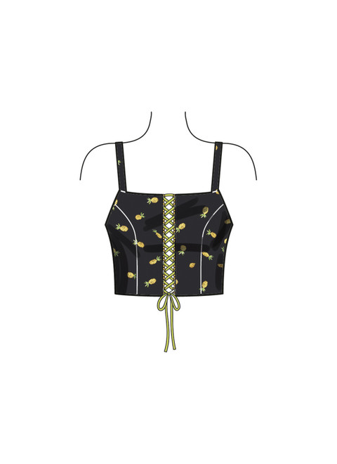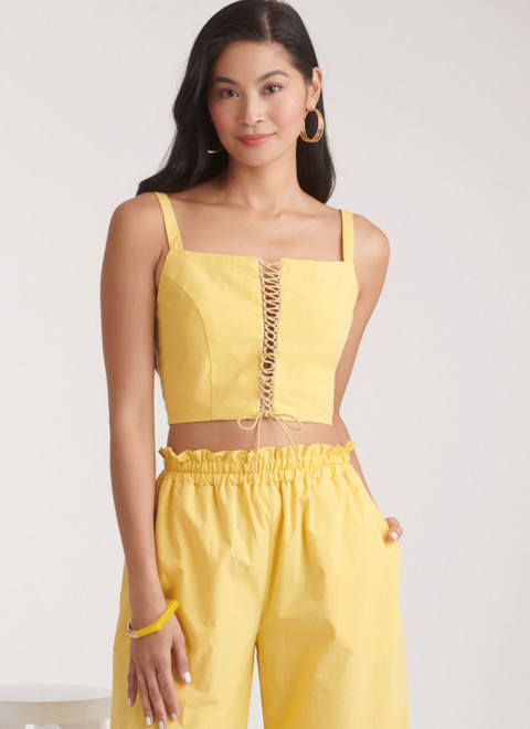 BH-tröjan har snörningsdetaljer framtill som kan bäras som en lagerplagg eller ensam som en söt, cropped topp. Byxor med breda ben har en hög papperspåse i midjan och sidosömsfickor.SÖMNADSBETYG ⓘ : Lätt