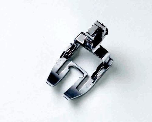 Fronten på pressarfoten har tagits bort för bättre synfält. Botten på foten är vinklad så att matningen av tråden blir jämn.