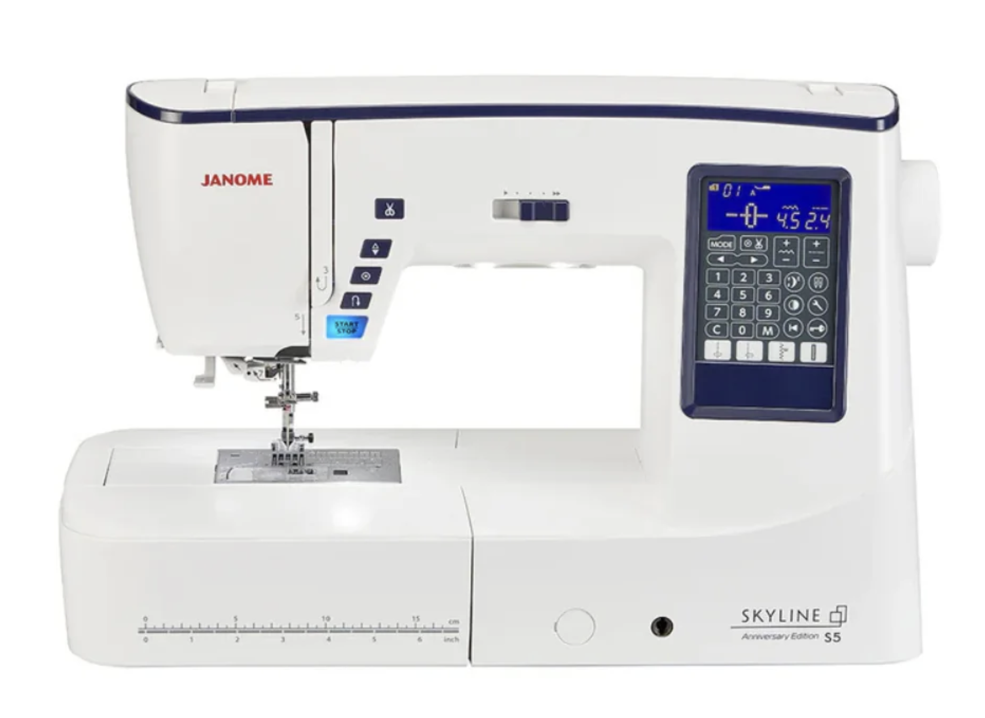 Då är Skyline S5 Anniversary Edition precis vad du behöver! Med sin moderna design, midnattsblå dekor och stabila konstruktion är den lika snygg som funktionell – oavsett om du syr hemma, i skolan eller professionellt.
