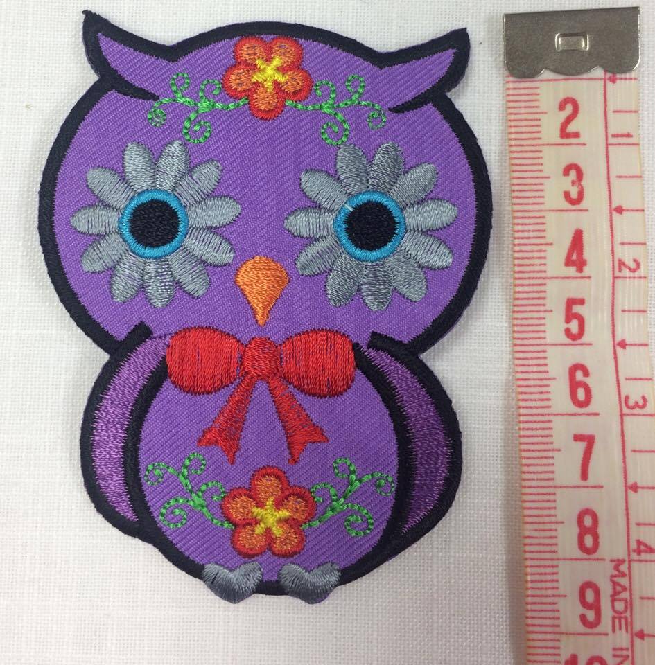 Märke med lila uggla Att stryka på ,men sitter bäst i tvätten om man sätter ett par stygn.