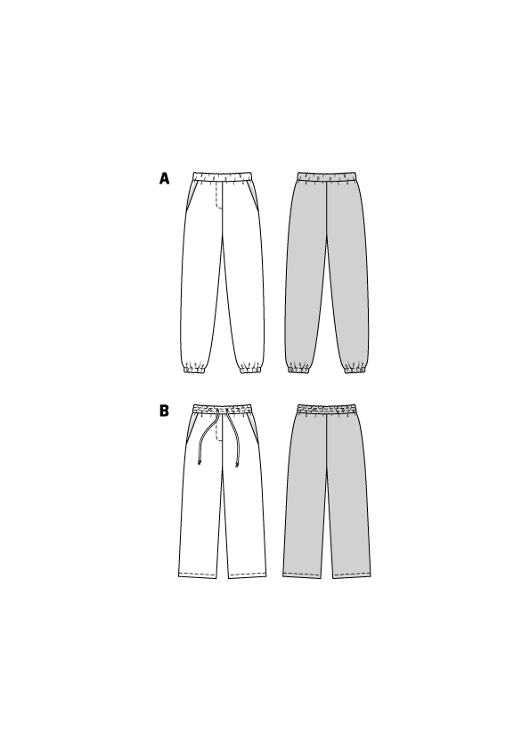 Comfortable trousers/pants for many occasions, with angled pockets and an elastic waistband ? stretch fabric is a requirement for this style. The long legs of view A are finished with elastic at the ankle. View B is cropped at 7/8-length with a wide leg. Both fool the eye with a mock front fastening.