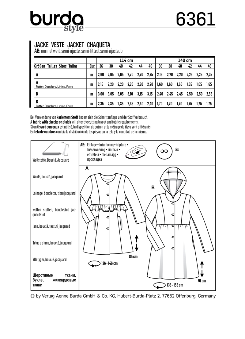 Both the long jacket and the short coat feature a high waist. A small frill is caught in at the seam for view A. The skirt of view B is slightly gathered. Pockets - we wouldn't want to miss them - are sewn in at the front panel seams or at the side seams.