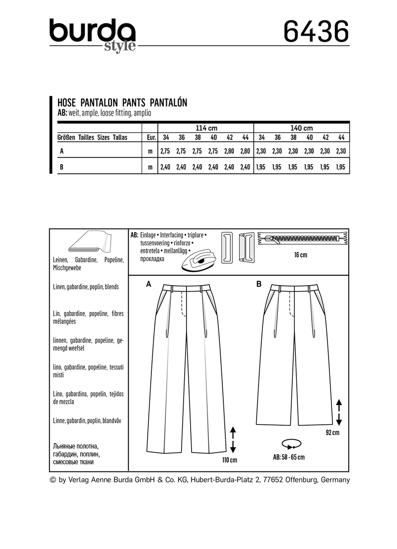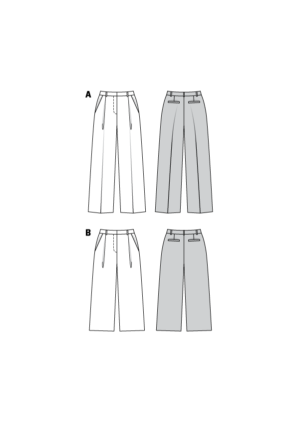 Trousers/Trousers with some masculine details but wide legs are current favourites. The pleated trousers/Trousers are classic in style with a shaped waistband and angled pockets. View A is full length with pressed creases. View B is a witty culotte length and pressed all around.