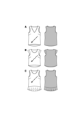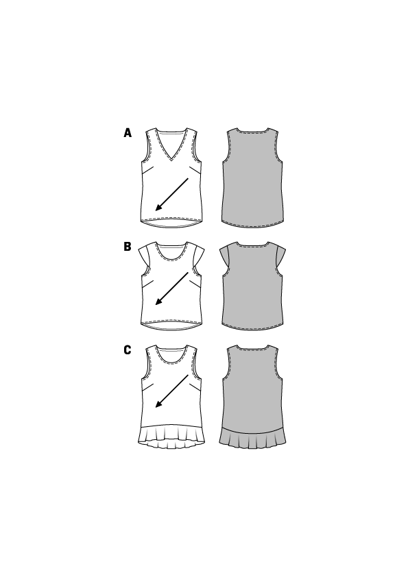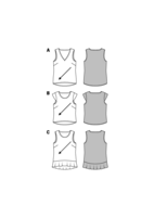 Stylish tops featuring contrasting details. View A shows off a V-neck while view B has a round neckline and sleeve bands. A flounce adorns the hem of view C. All three tops are cut on the bias for an especially nice drape of the garment.