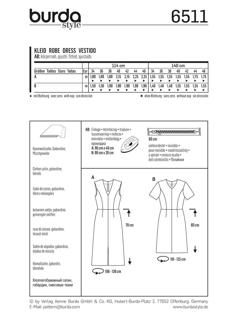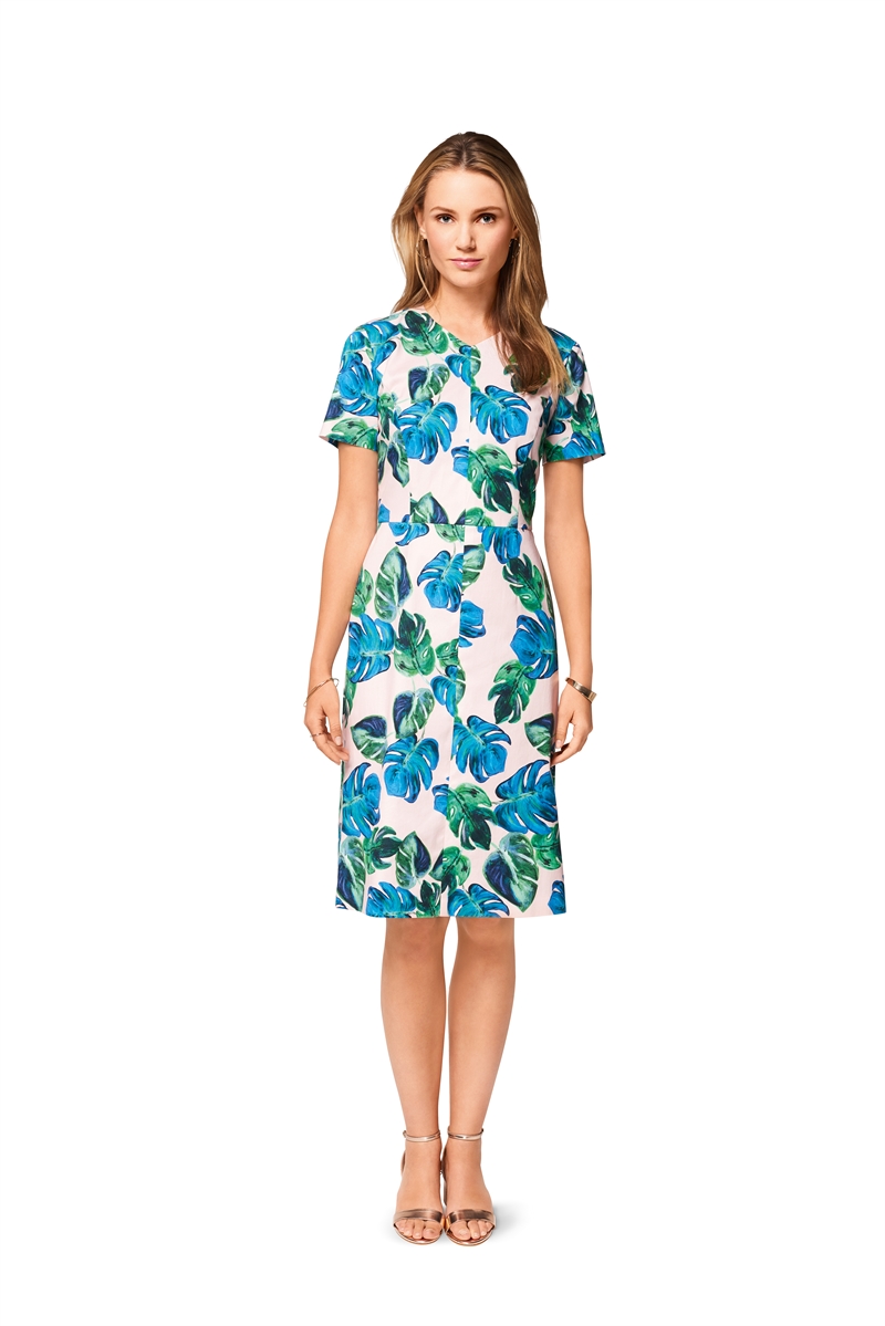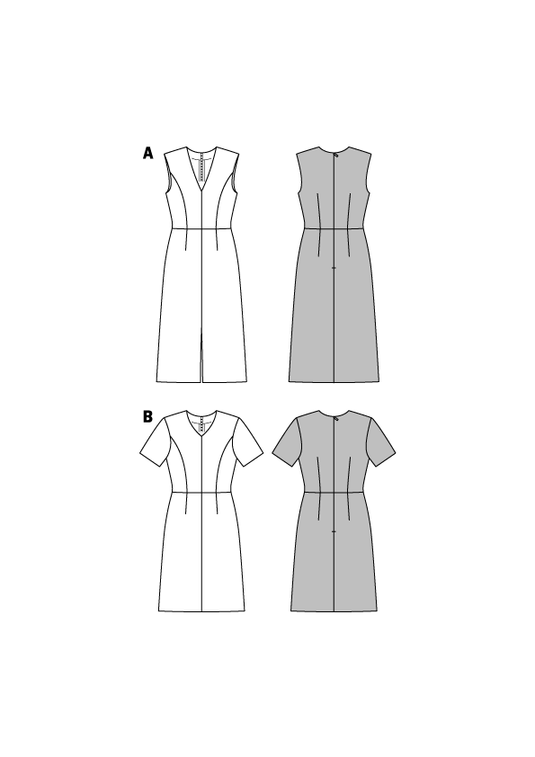 Sleek, fitted dresses with panel seams and a 4-panel skirt in two lengths. View A is sleeveless, with a deep V-neck and center front vent. View B has a less pointed V-neck and short sleeves.