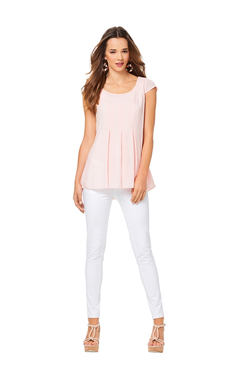 Airy, loose-fitting dress with a curved yoke and pleats stitched to about waist level in front and back. View A is sleeveless and knee-length. View B follows the same lines but features small cap sleeves to nicely cover your shoulders.