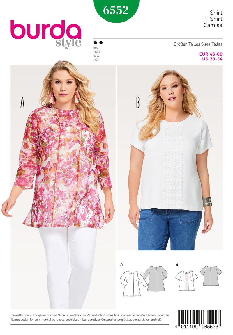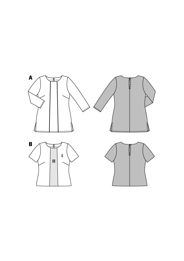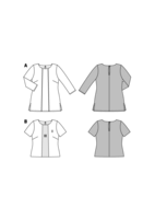 Loose-fitting easy tops in plain or print fabric will always flatter your figure. View A features 3/4-sleeves, side slits and piped front panel seams. View B is made up in two different fabrics and has short sleeves.