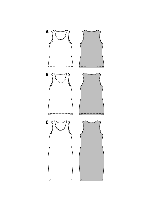 A simple top in two lengths and the jersey dress with a round neckline will show off your curves. Bust darts beginning from size 28 (54) will ensure a good fit. This is a garment to just slip over for summer fun.