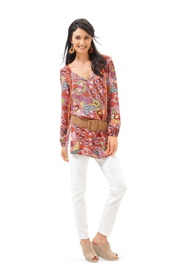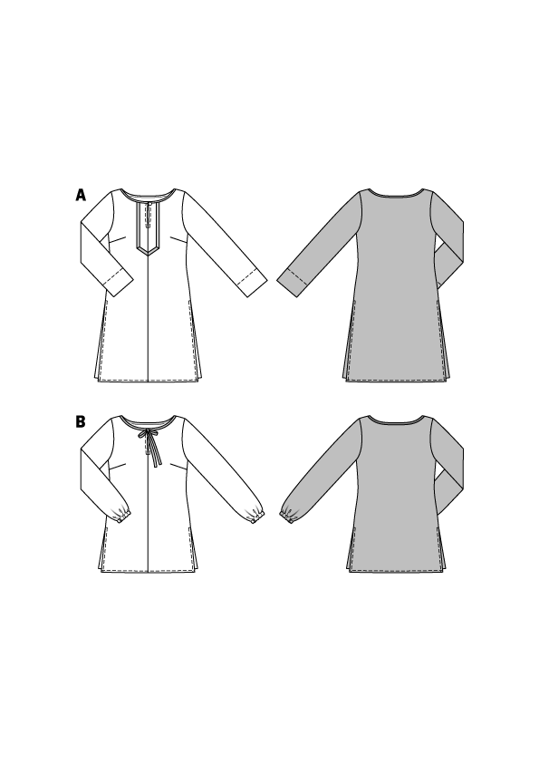 Two chic styles for a tunic top and blouse, both quick and easy to sew. Each has side slits and binding at the neckline as an added detail. The center front seam is left open to create the front slit. For view A, the slit is embellished with trim.