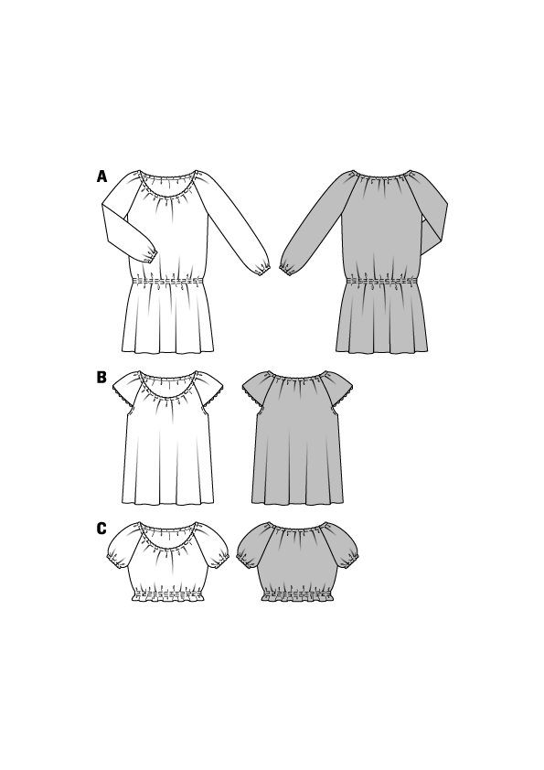 Airy dress and blouses in two lengths with raglan sleeves. The elastic neckline allows you to wear it off the shoulder if you like. Dress view A has long sleeves and an elastic waist. The Carmen blouse view B has short sleeves. The mid-drift blouse view C