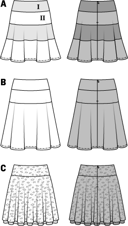 Skirts which swing are perfect for easy-going summer days. Either composed of different fabrics or plain or patterned or double-layered - the hip yoke with rear zipper ensures a perfect fit of all variants.All patterns with seam & hem allowances