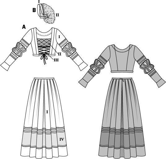 Two-piece gown: fitted bodice, rectangular neck, front lacets and open-work sleeves. Skirt laid in deep folds at the waist. Precious materials, lace, golden trimmings and a hairnet with all its periods features.