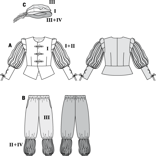 Jacket and Trousers with quilted slits on sleeves and Trouser legs, string lacing at the cuffs. Add to this a flat brim hat and feather.