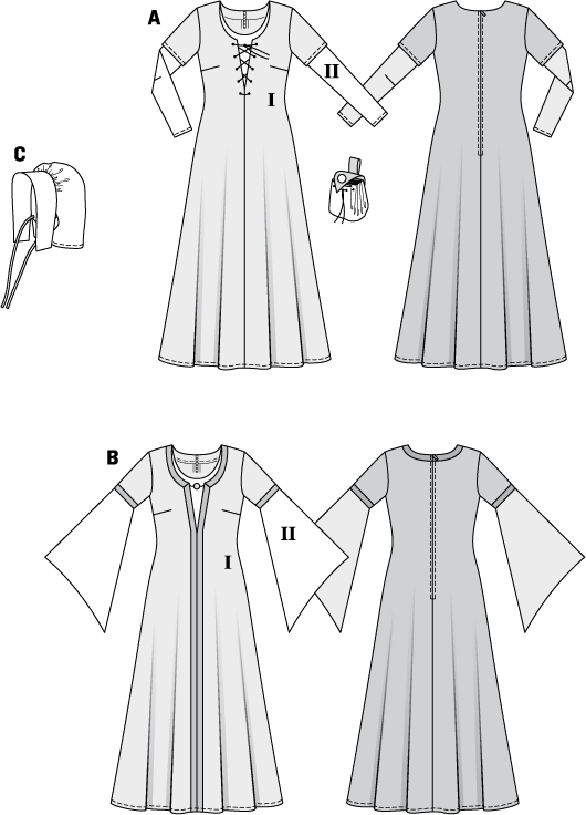 Dress for a noblewoman or a damsel. Model A: The undershirt is quilted in the front. Dress B has board trumpet sleeves and trimming.