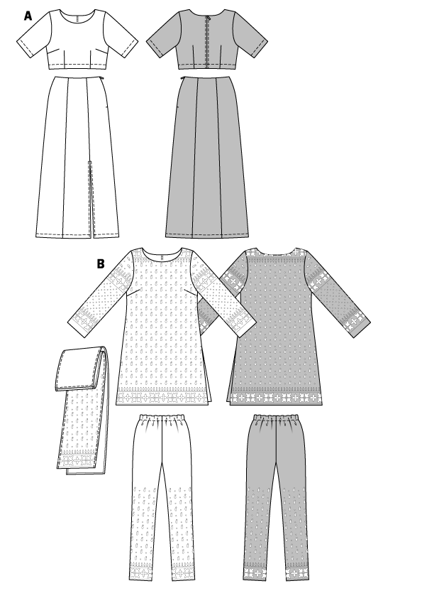 SARI /TUNIC / PANTS Variant A with short blouse, long skirt and traditional sari. Variant B. Tunic, slim Trousers and shawl - sewed from one sari.