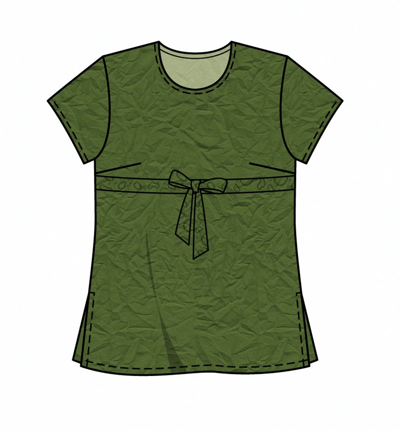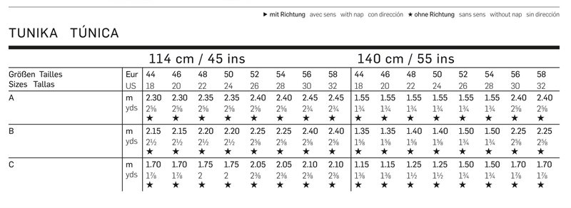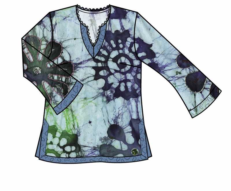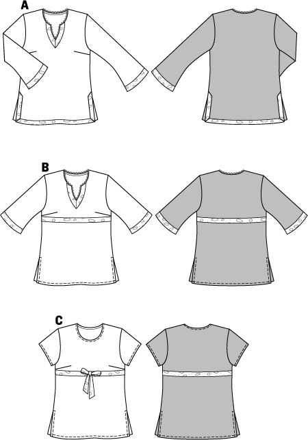 Chic tunic in three fashionable styles. A with long trumpet sleeves, B with flared ¾-length sleeves, both with a slit neckline and decorative trimming. C with short sleeves and crewneck