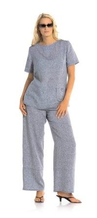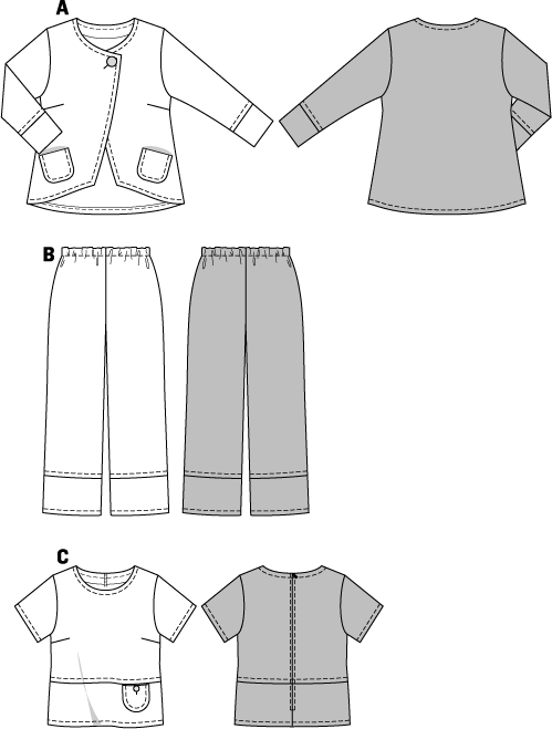Casually chic with A-line jacket that is a bit shorter in the front. The boxy shirt with extension seam and decorative pocket matches perfectly with the wide bungee-cord Trousers.
