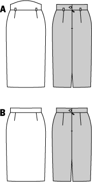 Pencil skirt in two lengths. Skirt A with high waistband and belt loops. Both skirts have a walking slit.