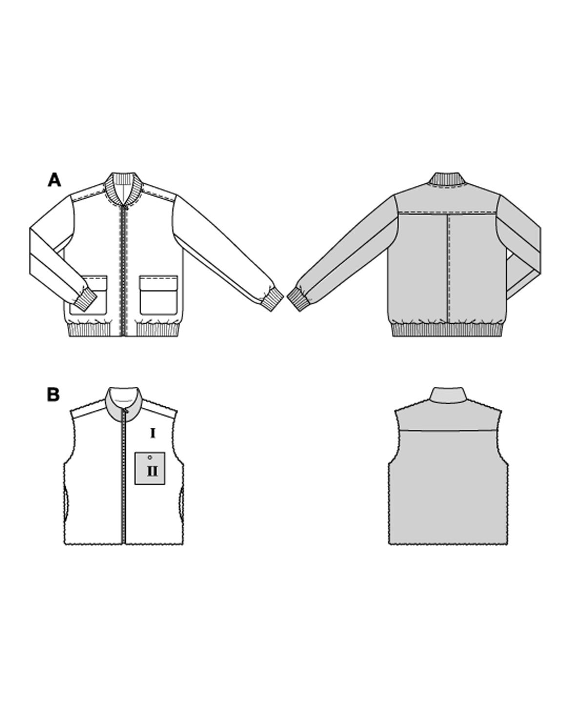 Upptäck vårt herrmönster för en variant av en jacka och en väst! Denna jacka med manschetter, extra stora fickor och stickade sömmar är ett sant mästerverk. Västen är avslappnad och mysig, med fickor i sömmarna och en ståkrage. Sy den i släta tyger eller teddy för extra komfort – lämplig för hobbysömmerskor med avancerade färdigheter.