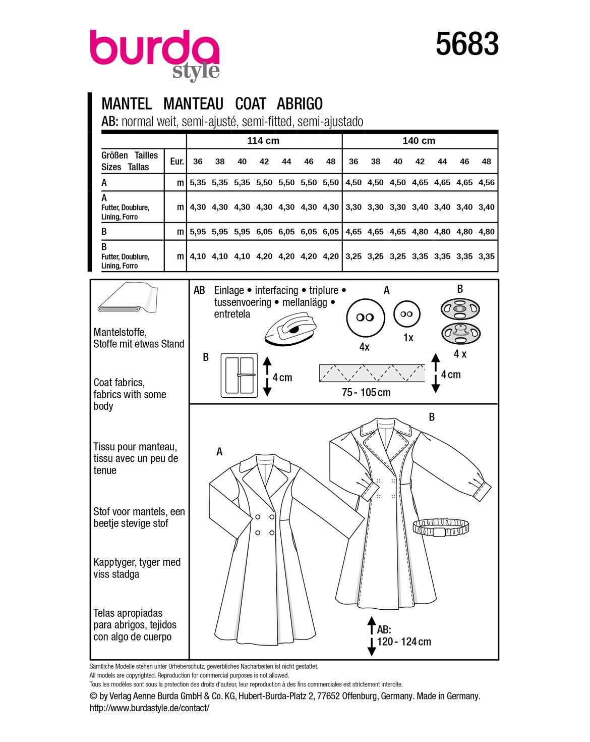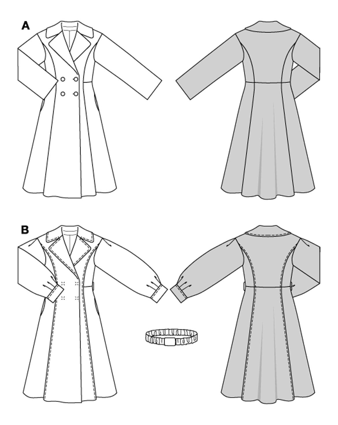 Upptäck två eleganta kappmönster som kommer att dra blickar till sig! Det första mönstret skapar en drömlik timglassiluett med nedsänkta axlar, en smal midja och en vid, utsvängd kjol. Praktiska funktioner inkluderar djupa sömfickor och vida ärmar. Det andra mönstret ser coolt ut som en trenchcoat vid första anblicken, men imponerar med feminina detaljer som en XL-krage och voluminösa manschetter. Dessa modeller kräver viss sömnadserfarenhet.