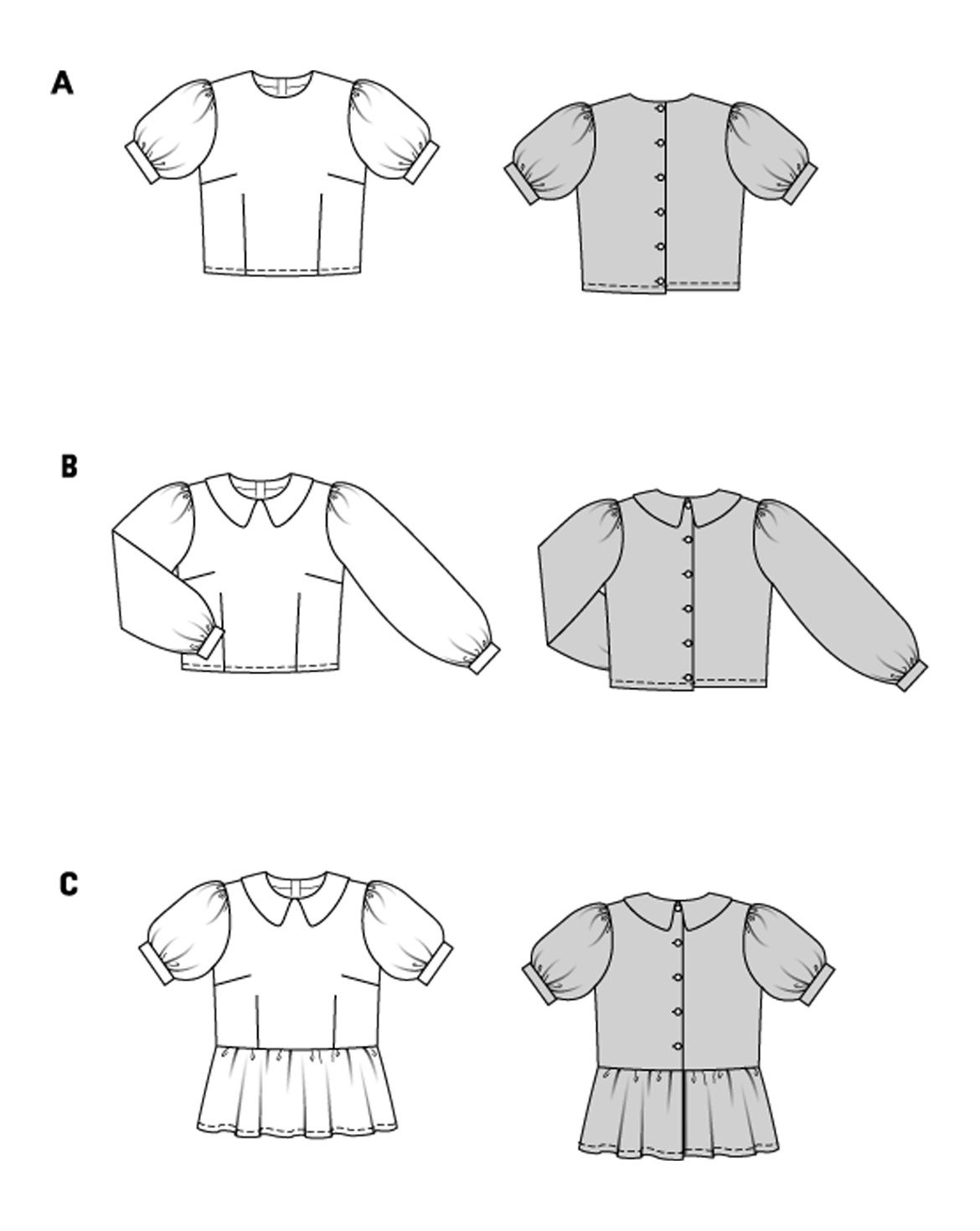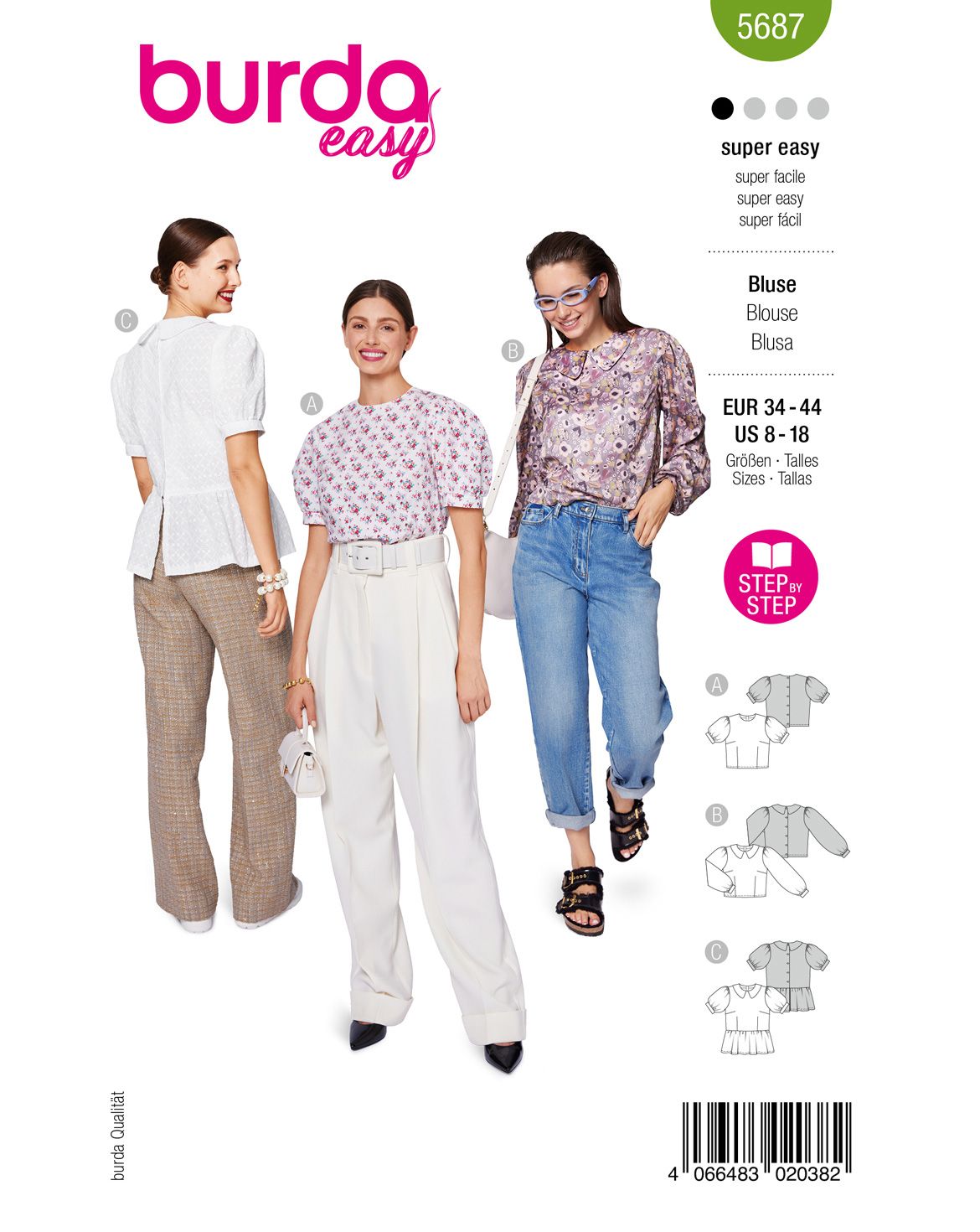 Upptäck tre trendiga blusmönster från Burda Easy. Den första versionen imponerar med ett avslappnat blommönster och puffärmar som knäpps baktill. Den andra blusen, med långa puffärmar och blommönster, är perfekt för både kontoret och fritiden. Den tredje versionen, tillverkad av fint broderie anglaise med Peter Pan-krage och knappar baktill, ser särskilt söt ut. Tre mångsidiga och lättsydda blusmönster i ett!