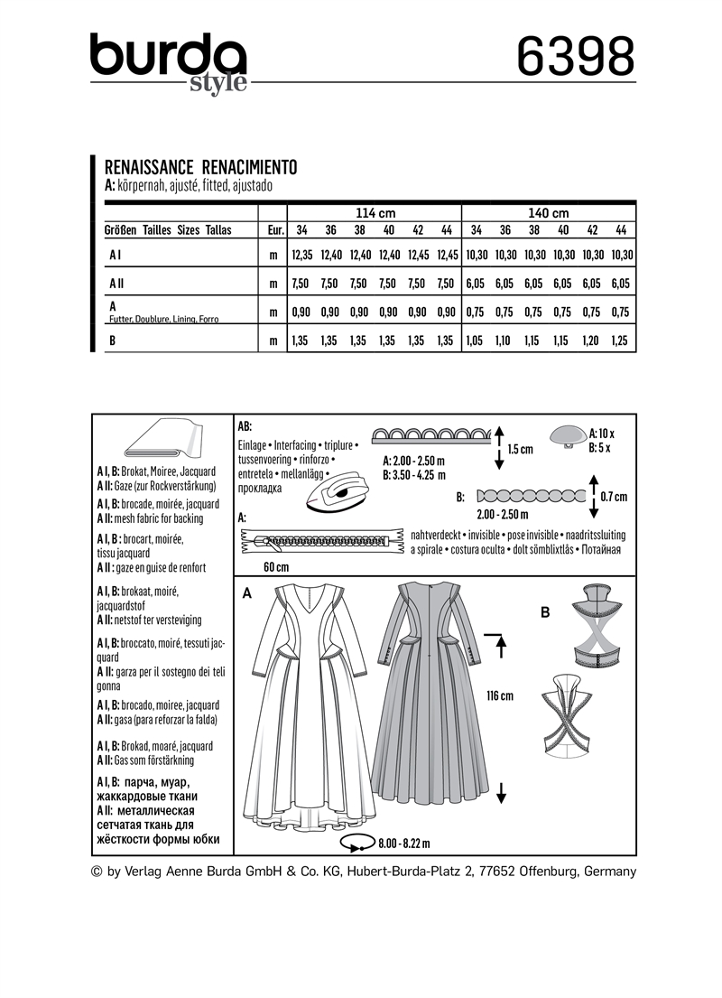 A splendid Renaissance style dress with a full skirt. An underskirt of mesh fabric supports the skirt and accents the hips. The separate shaped belt actually includes a high collar. The belt is crossed in front and has a loop fastening in back. Lush fabrics and extra trim will ensure splendour!