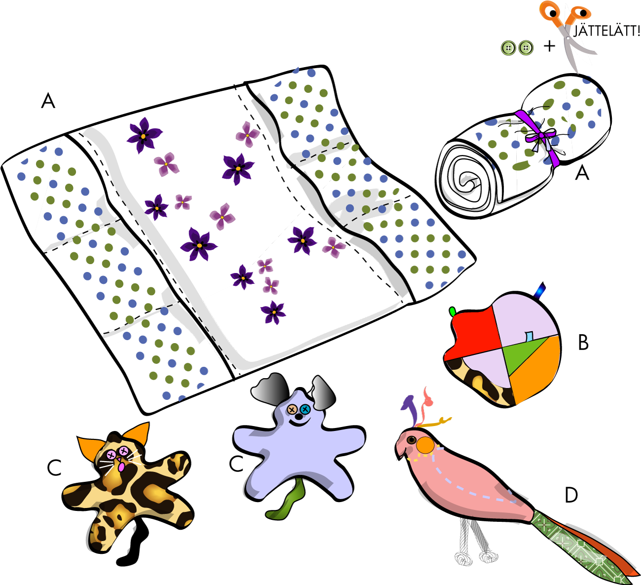? C: Kombinera tygrester eller 3-4 bitar som är ca 25x25 cm. Öronen kan gärna göras i ett avvikande tyg.