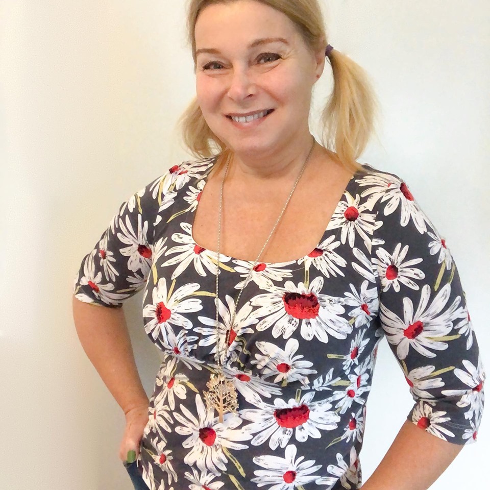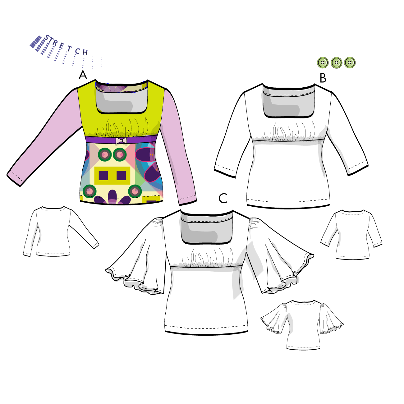 Toppar för stretchtyger i tajt modell. Välj på lång smal ärm, 3/4-lång smal ärm eller mycket vid helcirkelärm. Avskuren under bysten. Byst-delen sys dubbel, där bara den yttre delen rynkas. För glada effekter - blanda enfärgat och mönstrat!