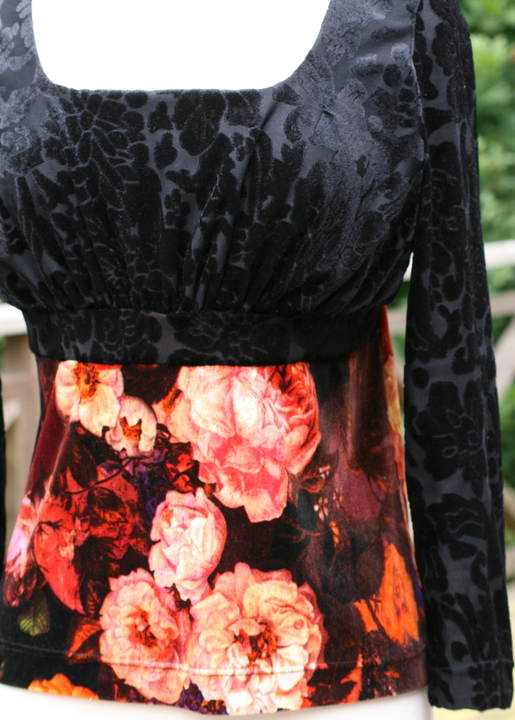 C:Topp med helcirkelärm med rynkad ärmkulle. Ärmen kan sys i ett avvikande tyg som inte behöver vara stretchigt, t ex tunn chiffong, spets eller något annat du tycker kan passa just din topp.