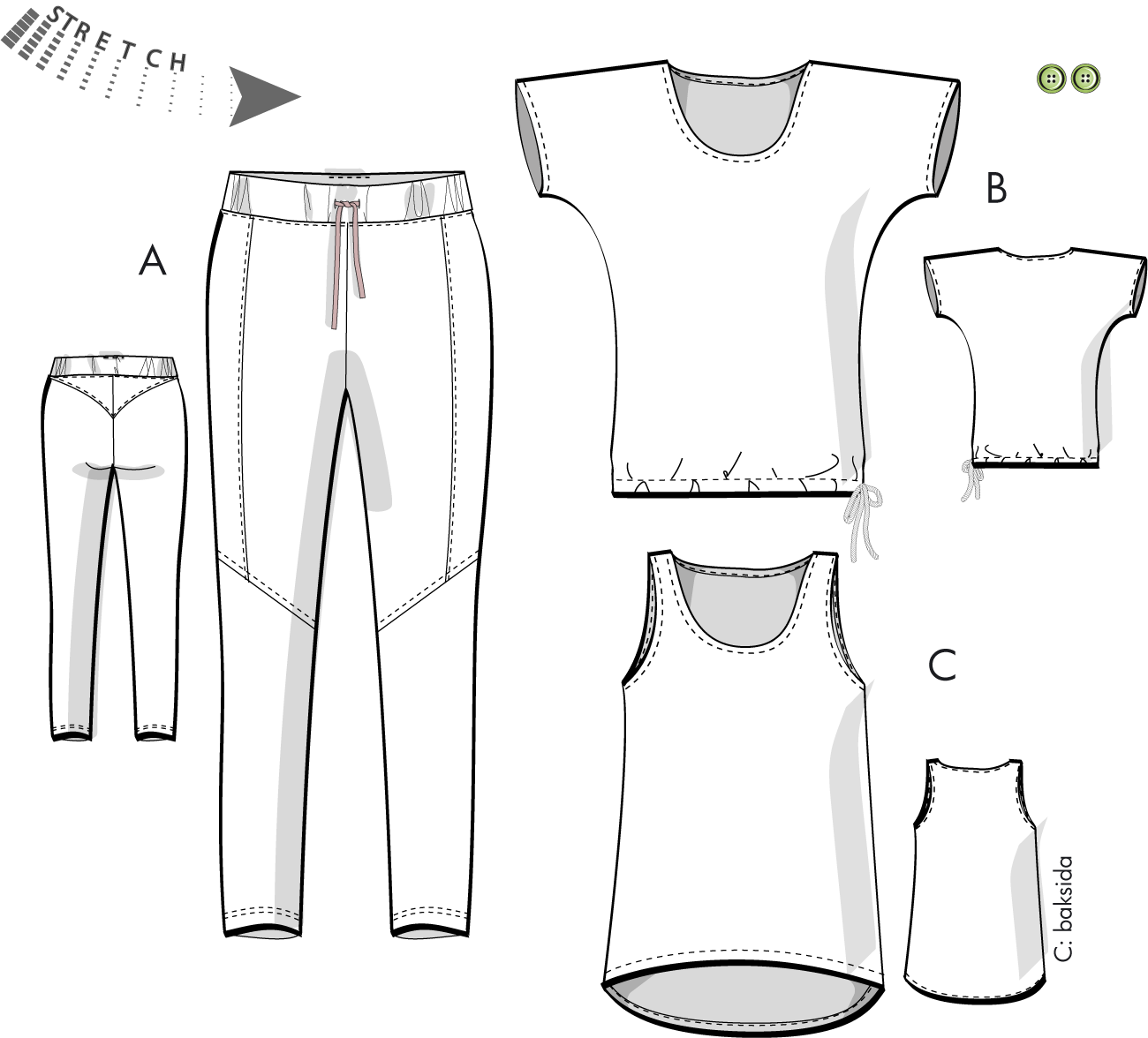 Leggingmönstret är anpassat för mycket stretchiga och lite kraftigare trikåtyger med ca 20 % stretch, mönstret till toppar för tunna trikåtyger med 4-5% stretch. Du kan även sy leggings av tyg med 4-5% stretch men välj då en större storlek, annars kan de bli för tajta.