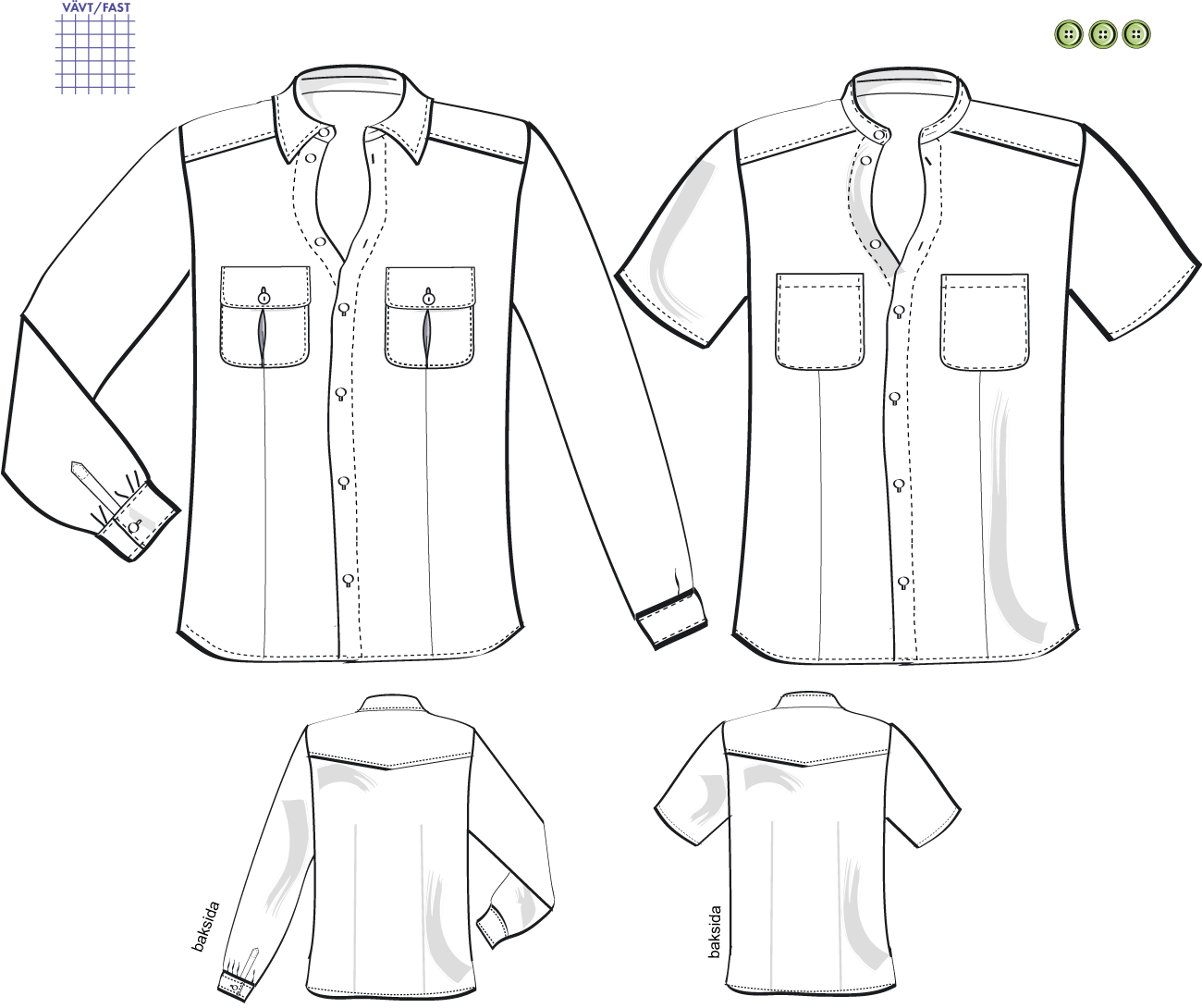 Skjorta med lång eller kort ärm. Besparing på axeln både fram och bak (kan även sys helt utan). Passar de allra flesta tyger, ev. även tyger med lite stretch (välj då en storlek mindre). Kragar, ärmar och fickor kan kombineras efter eget tycke och smak.