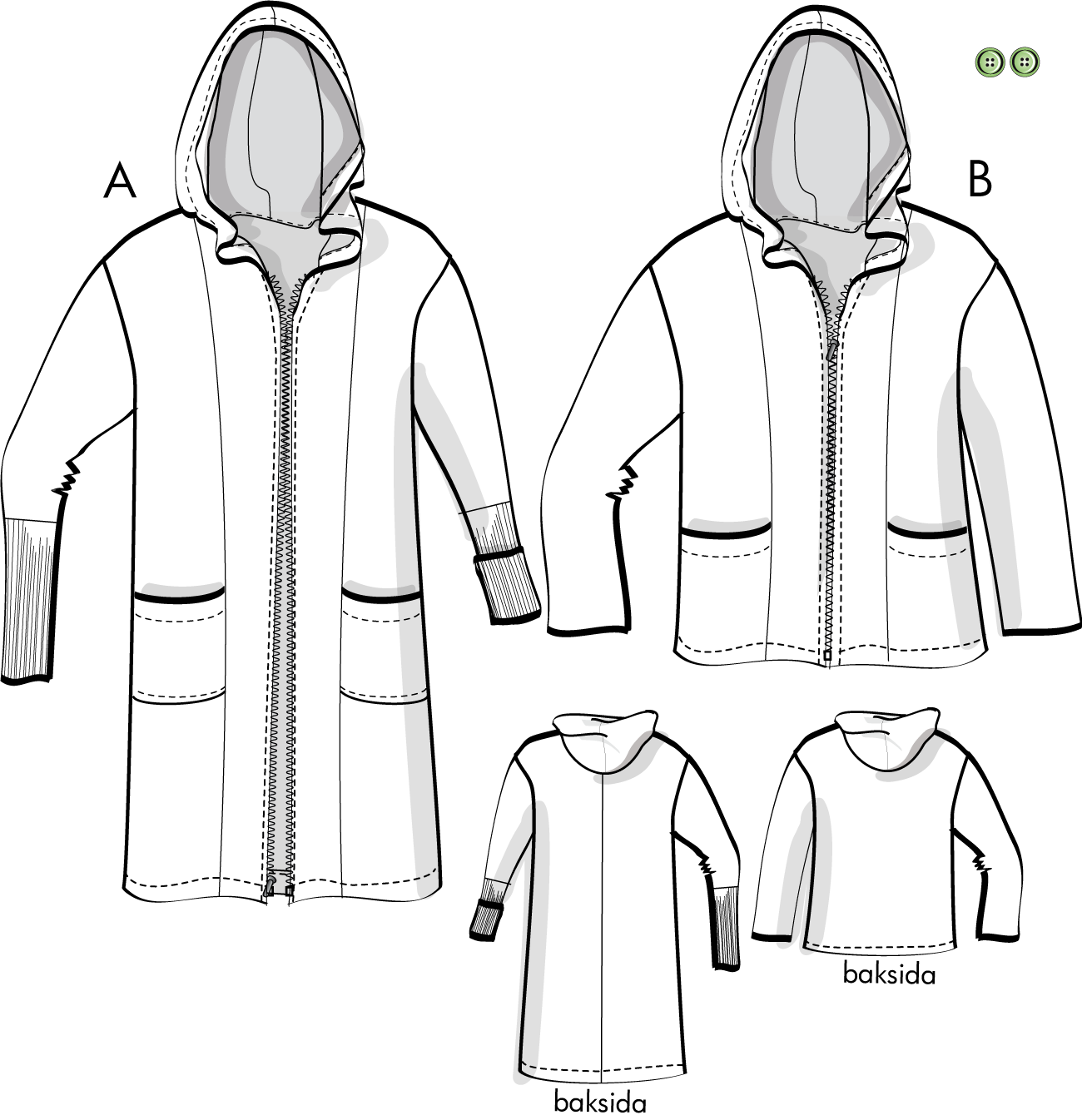 Stor luva på lång eller kort rak jacka, välj smala muddärmar som kan rullas upp eller rakare släta. Fickorna och blixtlåset kan väljas bort om du hellre vill ha utan.