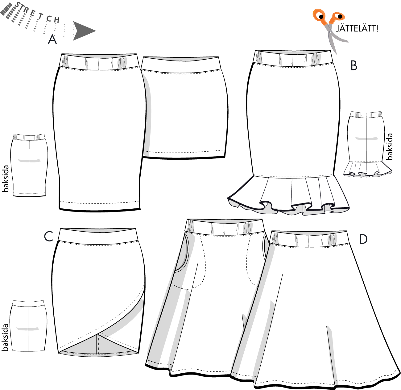 Enkla men funktionella kjolar för stretchig trikå som passar i alla sammanhang, jättelätta att sy. Bred linning med eller utan resår inuti - sytips i mönstrets beskrivning. De smala kjolarna har figurformad mitt bak-söm.