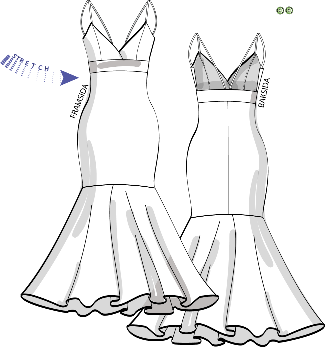 Den här modellen är anpassad enbart för elastiska jersey/trikå-tyger - även stretchiga spetstyger. Använd inte fasta vävda tyger, då blir plagget för snävt! Exempel på lämpliga kvaliteter kan vara trikå/jersey-tyger av viscose/elastan, bomull/elastan (tunnare kvaliteter) eller polyester/nylon med lycra eller elastan. Även stickade tyger och spetstyger går bra, bara de är tillräckligt elastiska. Du bör helst sy alla hopsättningssömmar på overlockmaskin. Alternativt kan du använda en av de elastiska sömmarna på din vanliga symaskin.