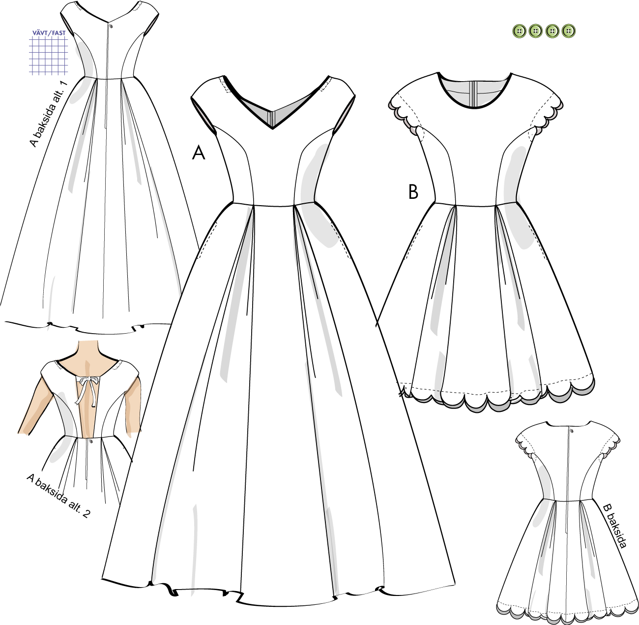 Bal-, brud-, fest-, eller riktigt fin sommarklänning, avskuren i midjan och med prinsesskärning i livet och liten holkärm. Variera halsringningarna och ryggpartiets utseende som du vill. Fickor i sidsömmarna (om du vill). Kjolen har dubbla motveck, 2 st fram och 2 st bak. Mönstrets längder är hellångt eller till knät. Blixtlås mitt bak. Passar att sy i många olika slags tyger, t ex bomull, siden, tunt linne, satintyger, fasta polyestertyger och viscose. Fodras om du vill eller om tyget kräver foder.