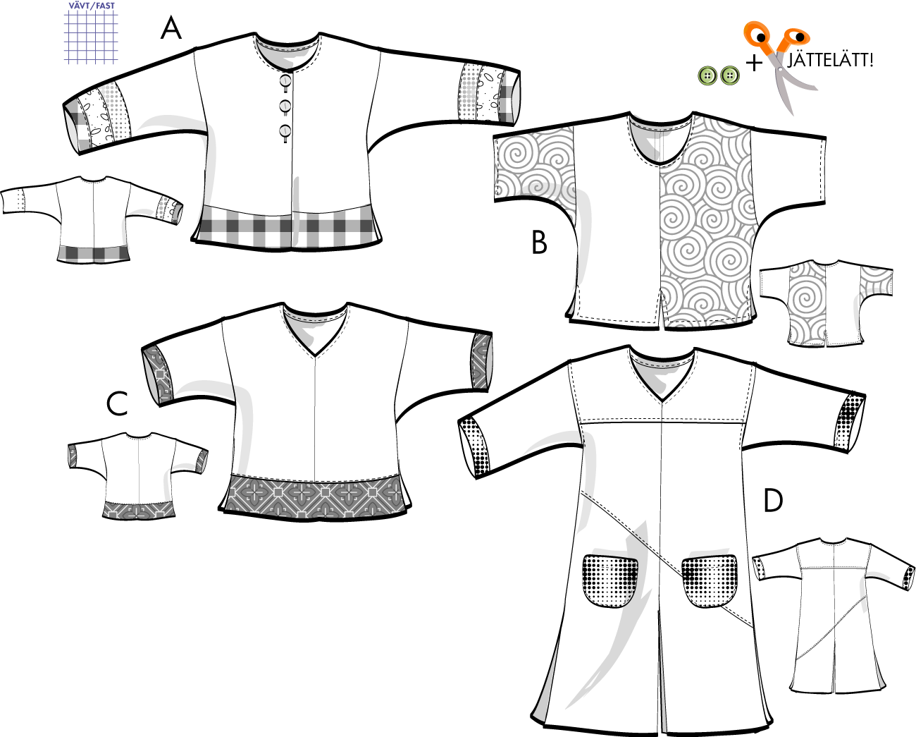 Rak blus eller klänning, med sprund i sidorna, som är klädsam på de flesta kroppar. Plagget kan delas upp i flera olika delar där du kan sätta ihop flera olika tyger, mönster eller strukturer som du matchar på just ditt eget unika sätt. Välj på tre olika ärmlängder och tre olika halsringningar, knäppning mitt fram eller söm. Blixtlås behövs inte - blusen eller klänningen kan träs över huvudet.