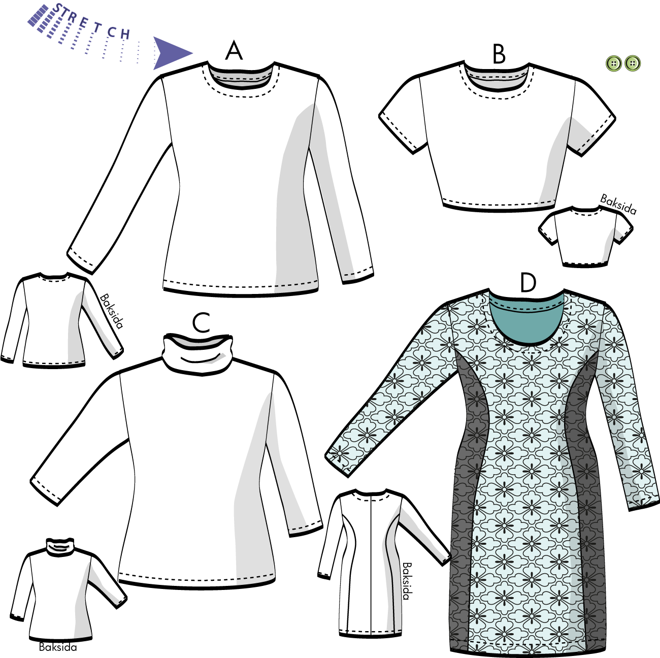 Enkel topp och klänning för stretchtrikå, med massor av variationer. Välj mellan kort, ¾-ärm eller lång smal ärm. Välj mellan en högre eller en något djupare halsringning eller varför inte en polokrage? Sy en så s.k. crop top eller varför inte en klänning som ger dig snygga kurvor! Klänningens sidopartier kan du sy i ett annat tyg. Blanda enfärgat och mönstrat, hur du vill! Obs! Dessa modeller är endast gjorda för att sys i stretchtrikå, med inslag av 3-5 % elastan, lycra, spandex etc.