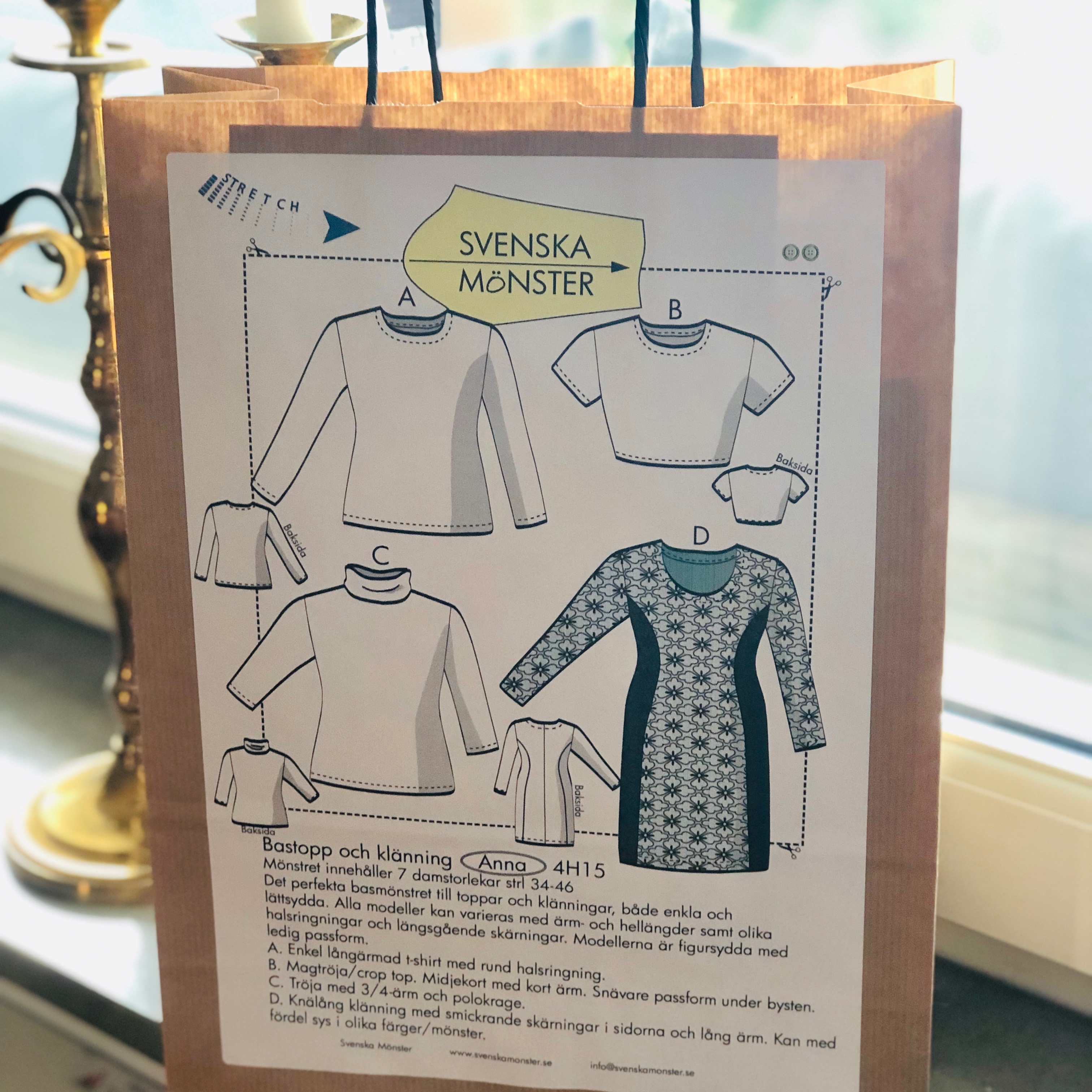 Basmönster för trikåplagg. Topp eller kort klänning. Symönster för stretchiga trikåtyger. Lätt att sy.Storlekar i mönstret är damstorlekar 34-46.