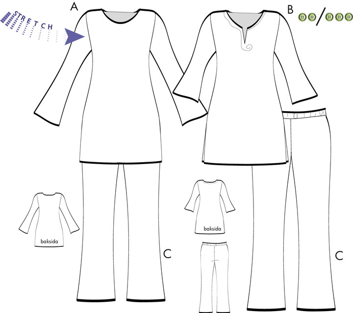 Tunika och byxor, mönster för stretchiga jerseytyger.