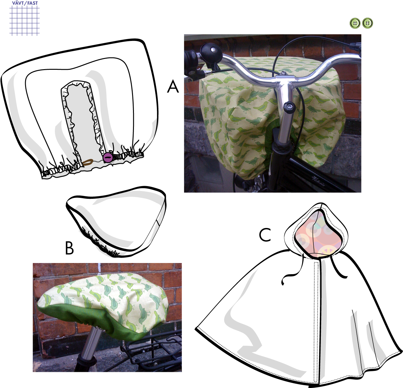 Cykelkorgsfodral, cykelsadelfodral och regncape. Mönster för vävda tyger. Lätt att sy.En storlek som passar de flesta klassiska cyklar.