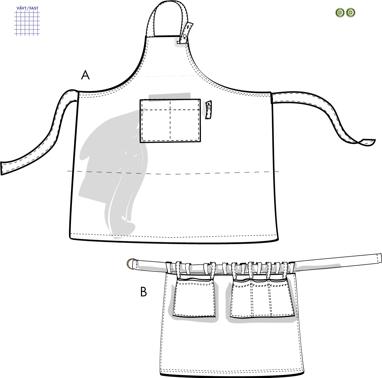 A: Klassiskt bröstförkläde för mat och bak eller annat kladd. Stor ficka fram och smart hank till handduk eller trasa. Välj knäkort eller rejält långt! Välj på att göra ett reglerbart nackband med knapp och knapphål som sys fast i överkanten eller så gör du ett enda långt band som träs igenom kanaler i de böjda sidorna. Knyts i midjan bak.