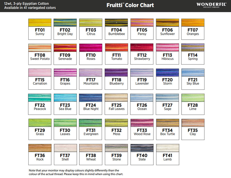 Fruitti ™ är en 12wt egyptisk bomullstråd med ett djärvt och dramatiskt utseende. Fri från vaxer och beläggningar som kan skada din symaskin. Den är idealisk för att visa dina sömmar och mönster och lägger lite mer färg på dina projekt. Finns i 41 roliga och lekfulla olika färger.