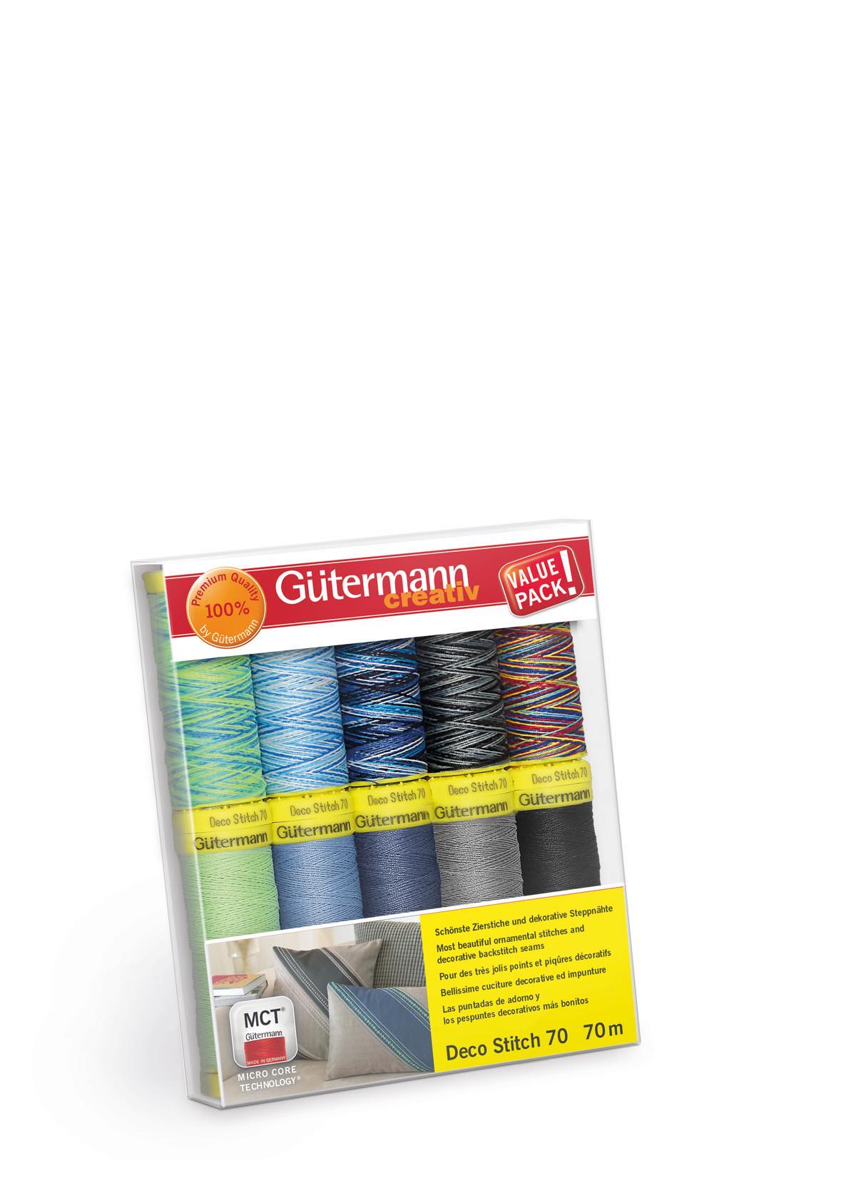 Trådset innehållande 10 st trådrullar Deco Stitch 70 i 5 st enfärgade och 5 st flerfärgade trådar. Gütermann 70 meters Deco Stitch tråd no.70 används för vackra dekorationssömmar och dekorativa stickningar. Den ger en silkig glans och en imponerande 3D effekt till dina sömmar. Med sin grovlek är den högkvalitativa tretvinnade sytråden perfekt anpassad till stygntätheten hos dekorstygn med hushållssymaskiner. Tvättbar upp till 95 grader. Symaskinsnål: Standard NM 90-100