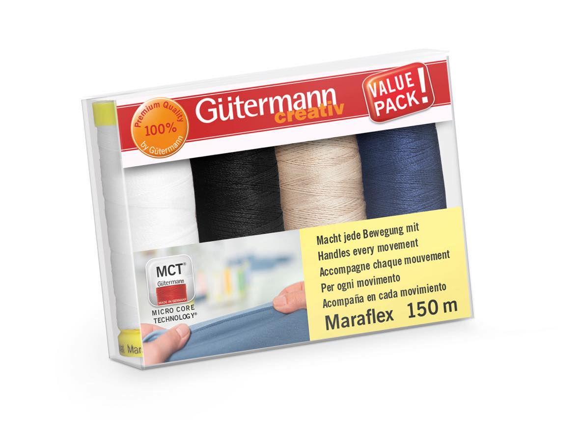 Trådset innehållande 4 st trådrullar med Maraflex tråd 150 m i basfärger. Gütermann 150 meters Maraflex tråd no.120 är elastisk sytråd med särskilt hög stretch. För flexibla sömmar med raksöm Upp till 80 % sömsträckning. Anpassar sig optimalt i stickat tyg och elastiskt vävda tyger. Symaskinsnål: Jersey / Stretch NM 70-80
