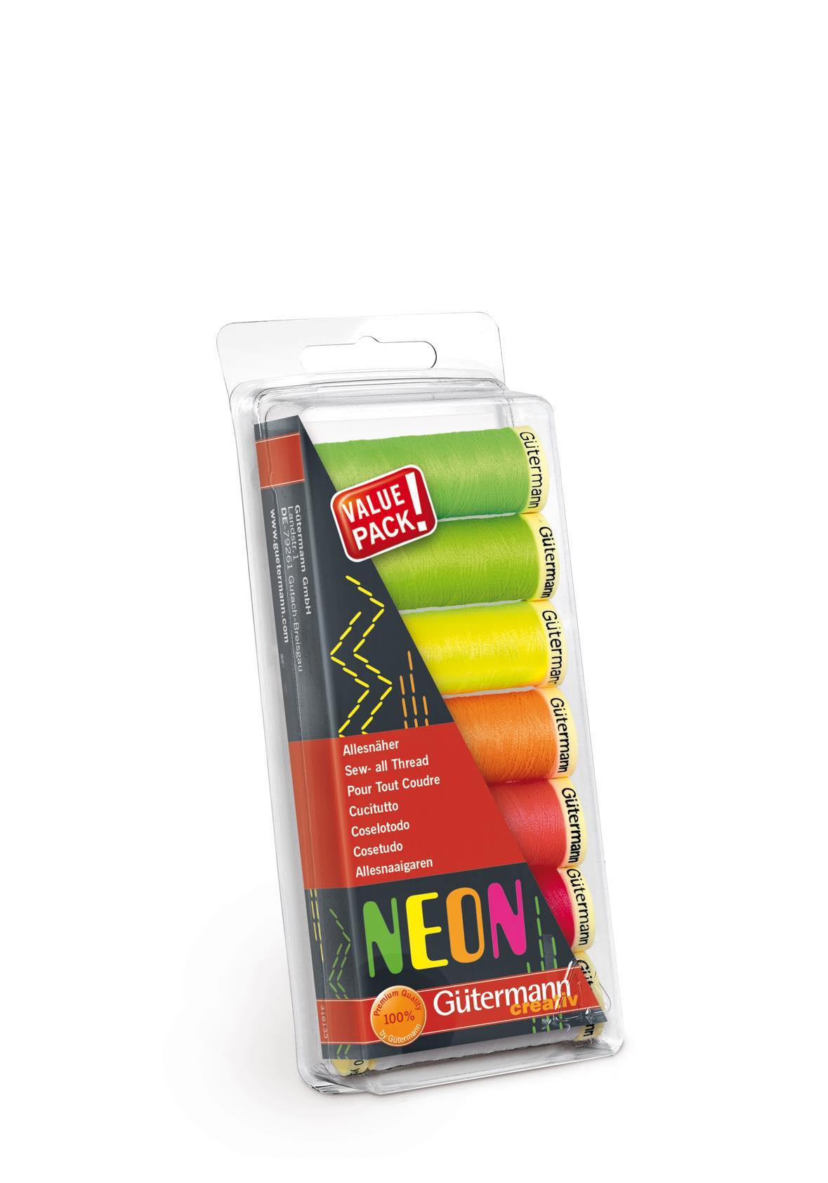 Trådset med 7 st trådrullar "Alla tygers tråd 100 m" i 6 st lysande neonfärger och vitt i bonusförpackning. Gütermann 100 meters polyestertråd är utmärkt lämpad för både symaskin-, overlock- och handsömnad, oavsett typ av söm. Tvättbar upp till 95 grader. Symaskinsnål: Standard 70-90