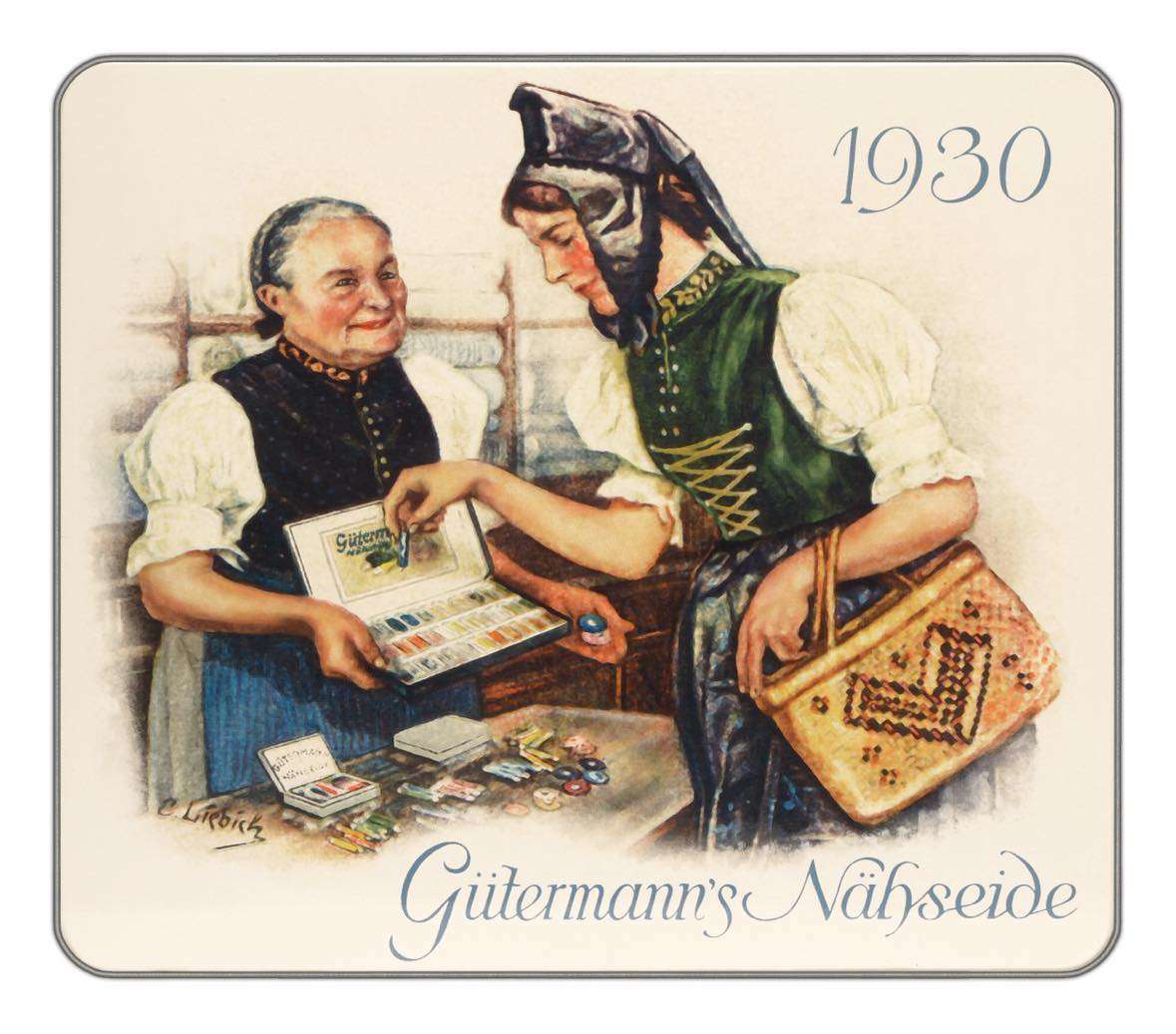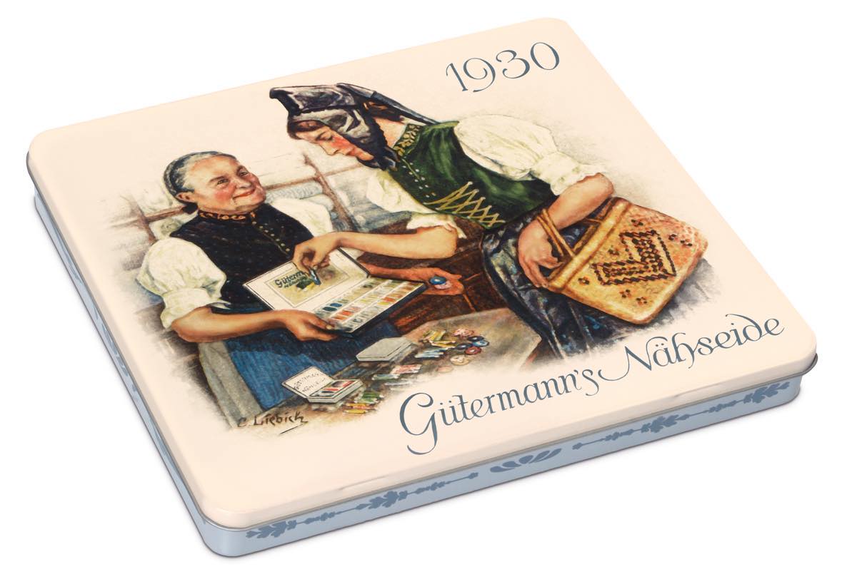 Förvaringsbox med nostalgiskt motiv innehållande 30 st trådrullar "Alla tygers tråd 100 m" i olika färger. Gütermann 100 meters polyestertråd är utmärkt lämpad för både symaskin-, overlock- och handsömnad, oavsett typ av söm. Tvättbar upp till 95 grader. Symaskinsnål: Standard 70-90